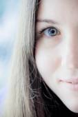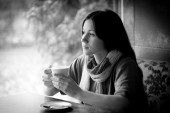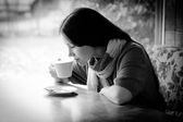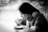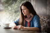 Piękna młoda kobieta z filiżanką herbaty w kawiarni
