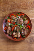 Smażone mięso, boczek, czerwona papryka pieprz i szpinak płyta