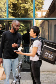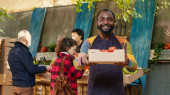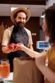 Czarna kobieta pomaga klientowi w sklepie spożywczym, promując lokalnie uprawiane i ekologiczne produkty. Komunikują się i wykorzystują technologię dla efektywnego procesu realizacji zamówień na rynku przyjaznym dla środowiska.