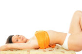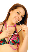 sexy brunetka pozowanie w czerwony strój kąpielowy