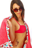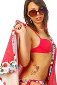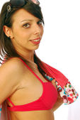 sexy brunetka pozowanie w czerwony strój kąpielowy
