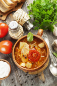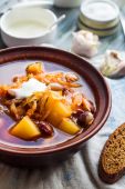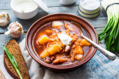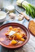 barszcz czerwony z kwaśną śmietaną, dziki czosnek, czarny chleb, rustykalne