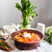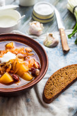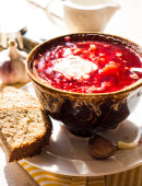 czerwona zupa z fasoli, buraki, kapusta i ziemniaki, śmietana