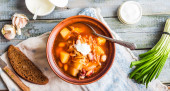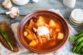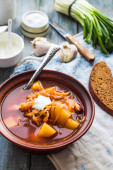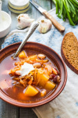 Zdjęcie "czerwony barszcz z fasolą, kwaśną śmietaną, dziki czosnek, chleb żytni, średniowiecznego kompleksu" może być wykorzystywane do celów osobistych i komercyjnych zgodnie z warunkami zakupionej licencji Royalty-free. Obraz jest dostępny do pobrania w jakości wysokiej rozdzielczości do 5760x3840.