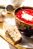 Zdjęcie "czerwony barszcz z fasolą, kwaśną śmietaną, dziki czosnek, chleb żytni, średniowiecznego kompleksu" może być wykorzystywane do celów osobistych i komercyjnych zgodnie z warunkami zakupionej licencji Royalty-free. Obraz jest dostępny do pobrania w jakości wysokiej rozdzielczości do 5760x3840.