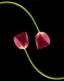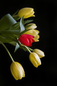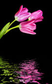 trzy świeże wiosenne refleced czerwone tulipany w wodzie na czarno z c