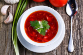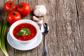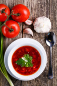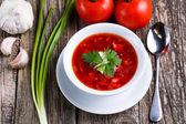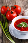 Barszcz z chlebem na tle drewniane.