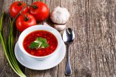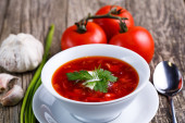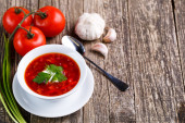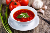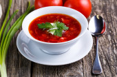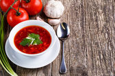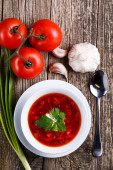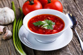 Barszcz z chlebem na tle drewniane.