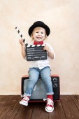 Zdjęcie "Chłopak reżyseruje scenę filmową z klaszczem przed kamerą." może być wykorzystywane do celów osobistych i komercyjnych zgodnie z warunkami zakupionej licencji Royalty-free. Obraz jest dostępny do pobrania w jakości wysokiej rozdzielczości do 5760x3840.