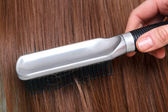 Kobieta z długie proste brązowe włosy na białym tle.