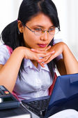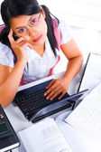 piękna młoda kobieta siedzi w biurze informacji turystycznej i pracy na lapt