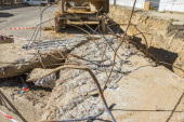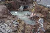 Korzystanie z koparki do zakopania 10 m3 betonowego szamba znajdującego się w ogrodzie obok domu.