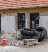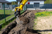 Zdjęcie "Korzystanie z koparki do zakopania 10 m3 betonowego szamba znajdującego się w ogrodzie obok domu." może być wykorzystywane do celów osobistych i komercyjnych zgodnie z warunkami zakupionej licencji Royalty-free. Obraz jest dostępny do pobrania w jakości wysokiej rozdzielczości do 5760x3840.