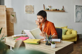Nastoletnia dziewczyna rozmawia przez telefon komórkowy podczas zarządzania jej e-learningiem na laptopie w domu.