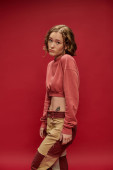 Młoda kobieta stoi z wdziękiem przed białą ścianą, emanując elegancją i pewnością siebie w czarnych spodniach i białej koszuli..
