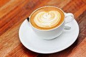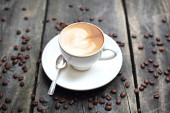 filiżanka do kawy latte art z ziarna na drewniane tła