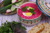 Okroshka z Kwas Chlebowy w drewniane miski i drewnianą łyżką