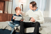 Zdjęcie "Ojciec i syn czytać książki lub tabletki" może być wykorzystywane do celów osobistych i komercyjnych zgodnie z warunkami zakupionej licencji Royalty-free. Obraz jest dostępny do pobrania w jakości wysokiej rozdzielczości do 5760x3840.