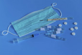 Rękawice chirurgiczne, maski, WPR i strzykawek na białym tle.