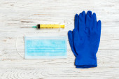 Rękawice chirurgiczne, maski, WPR i strzykawek na białym tle.