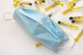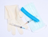 Rękawice chirurgiczne, maski, WPR i strzykawek na białym tle.