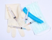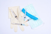 Rękawice chirurgiczne, maski, WPR i strzykawek na białym tle.