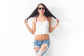 Zdjęcie "moda kobiety znajomych sobie okulary w lecie jeanswear ulicy miejskiego stylu casual zabawy na tle ściany z cegieł." może być wykorzystywane do celów osobistych i komercyjnych zgodnie z warunkami zakupionej licencji Royalty-free. Obraz jest dostępny do pobrania w jakości wysokiej rozdzielczości do 5760x3840.