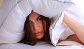 Kobieta leżąca na łóżku i zamykająca uszy poduszką