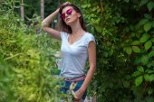 Cutie piękny blond kobieta z loong kwiaty na aparat