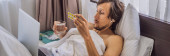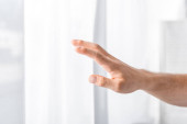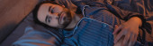 Mężczyzna siedzi na łóżku, spokojnie patrząc rano przez okno..