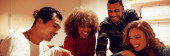 Grupa kolegów w przestrzeni współpracowników gromadzi się razem, zachwyceni treścią na ekranie smartfona.