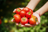 Framer gospodarstwa świeże pomidory organicznych w rzemiosło kosz.
