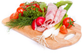 kurczak, nóż i warzywa na pokładzie cięcia, na białym tle