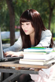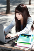 uśmiechający się azjatycki student studiuje.