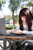 uśmiechający się azjatycki student studiuje.