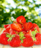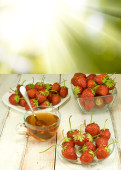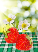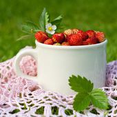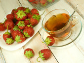 truskawki na płytkę i filiżankę herbaty na zielonym tle