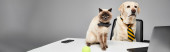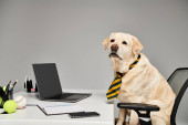 Wyrafinowany pies w krawacie siedzi przy biurku z laptopem, gotowy do walki ze światem biznesu.