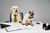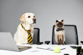 Zdjęcie "Wyrafinowany pies w krawacie siedzi przy biurku z laptopem, gotowy do walki ze światem biznesu." może być wykorzystywane do celów osobistych i komercyjnych zgodnie z warunkami zakupionej licencji Royalty-free. Obraz jest dostępny do pobrania w jakości wysokiej rozdzielczości do 5760x3840.