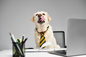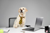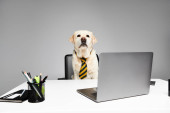Zdjęcie "Pies z uwagą siedzi przy biurku i czyta gazetę.." może być wykorzystywane do celów osobistych i komercyjnych zgodnie z warunkami zakupionej licencji Royalty-free. Obraz jest dostępny do pobrania w jakości wysokiej rozdzielczości do 5760x3840.