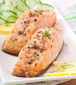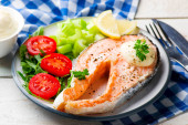 smażony filet z łososia z sosem z zielonego groszku