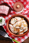 smaczne pierogi ze smażoną cebulą w misce brązowy, na tle drewniane