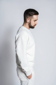 Zdjęcie "Stylowy mężczyzna z brodą siedzi pewnie na zielonym krześle w eleganckiej pozie na szarym tle.." może być wykorzystywane do celów osobistych i komercyjnych zgodnie z warunkami zakupionej licencji Royalty-free. Obraz jest dostępny do pobrania w jakości wysokiej rozdzielczości do 5760x3840.