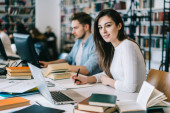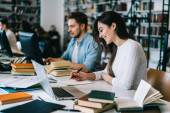 Korepetytor z rudymi włosami uczy nastolatkę przy stole w bibliotece, używając laptopa do nowoczesnych celów edukacyjnych..