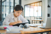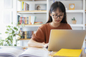 Zdjęcie "Nastolatek pochłonięty nowoczesną edukacją, otoczony książkami i laptopem, pilnie odrabiający lekcje przy biurku." może być wykorzystywane do celów osobistych i komercyjnych zgodnie z warunkami zakupionej licencji Royalty-free. Obraz jest dostępny do pobrania w jakości wysokiej rozdzielczości do 5760x3840.