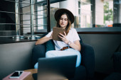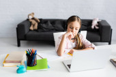 Nastolatka siedzi przy biurku, skupiając się na zadaniu domowym na laptopie i sprawdzając, czy jej komórka jest na bieżąco z nowoczesną edukacją..