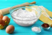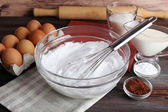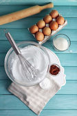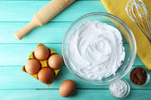 Bitą białka dla krem na drewnianym stole, widok z góry