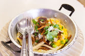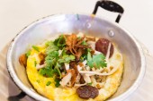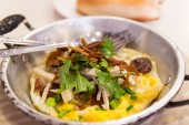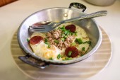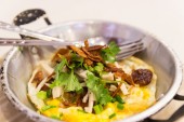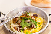 jajko sadzone z kiełbasa wieprzowa biały chrupiąca wieprzowiną, pietruszka, oni wiosna