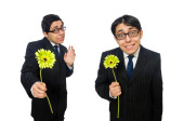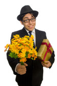 Młody człowiek w czarny strój z kwiat na białym tle