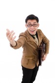 Młody człowiek w czarny strój z kwiat na białym tle