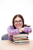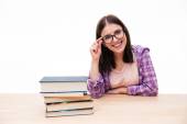 Szczęśliwa kobieta siedzi na podłodze i pisanie w notesie